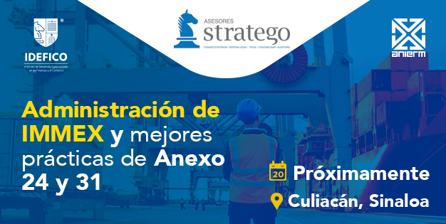 Curso Administración programa IMMEX Culiacán Sinaloa Fecha: Próximamente Horario: 4.00 pm a 7.00 pm Sede: Culiacán, Sinaloa Objetivo General En este curso se dará a conocer las actualizaciones de los requisitos para trámites relacionados a los programas de fomento...