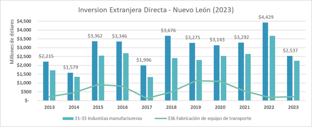 Nuevo León es la tercera entidad a nivel nacional en captar altos flujos de inversión, tan solo este 2023 la inversión anual ascendió a $2,537 millones de dólares una reducción del 42.70% en comparación anual. Sin embargo, también podemos apreciar que su mayor captor es la Industria Manufacturera, y como subsector la Fabricación de equipo y Transporte ocupa el cuarto lugar.