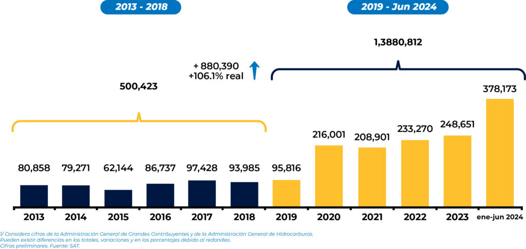 El SAT informó que, desde el inicio de la presente administración el 01 de diciembre de 2018 y hasta la actualidad, se han recaudado 3.4 billones de pesos, con motivo de la ejecución de auditorías y acciones de promoción de cumplimiento, reflejándose un crecimiento real del 113.4% en relación al sexenio anterior, ya que son 2.2 billones de pesos más que la administración pasada.