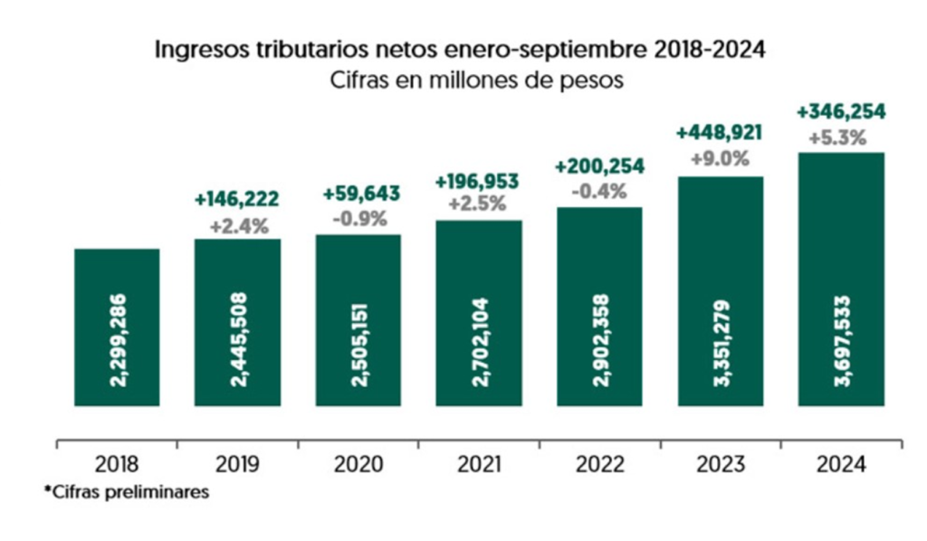El 21 de octubre el SAT dio a conocer que derivado de la implementación del Plan Maestro de Fiscalización y Recaudación, con corte al 3er trimestre de 2024, la recaudación tributaria tuvo un crecimiento real de 5.3%, en comparación con el mismo periodo de 2023, alcanzando los 3 billones 697 mil 533 millones de pesos, representando un incremento de 346 mil 254 millones de pesos, de conformidad con lo siguiente: