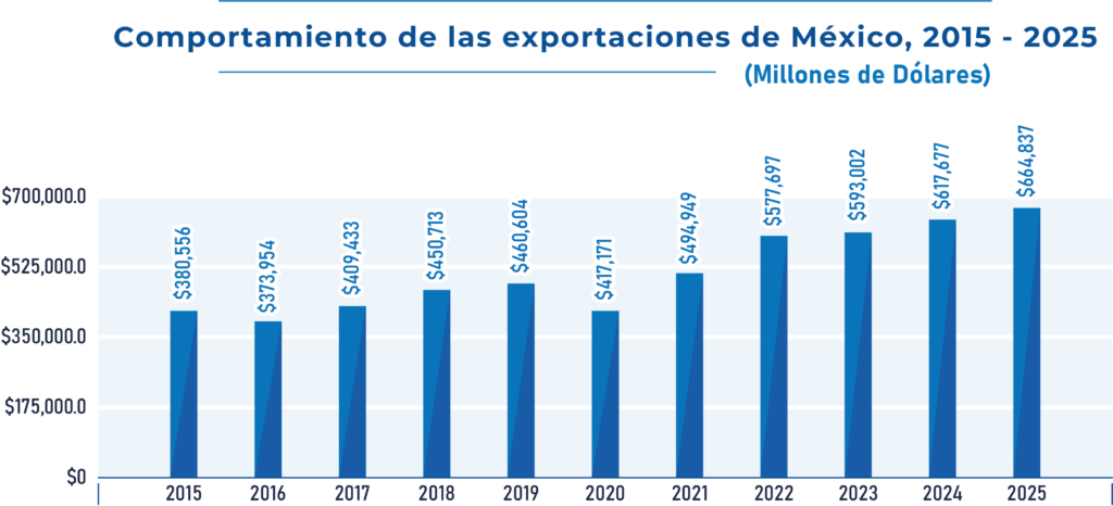 En 2025, México vendió al exterior bienes por un valor cercano a los 665 mil millones de dólares, la cifra más alta registrada hasta ahora. Según datos del Instituto Nacional de Geografía y Estadística, esta cantidad representa un crecimiento de 7.6% respecto al año anterior, en un contexto donde muchas economías del mundo enfrentaron vientos en contra.