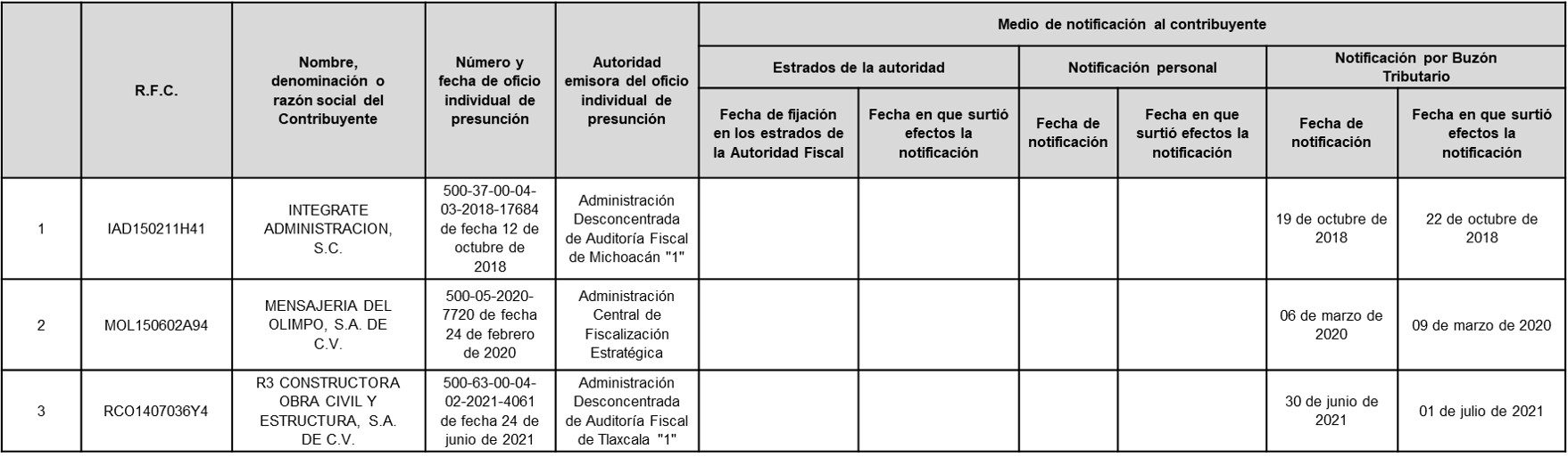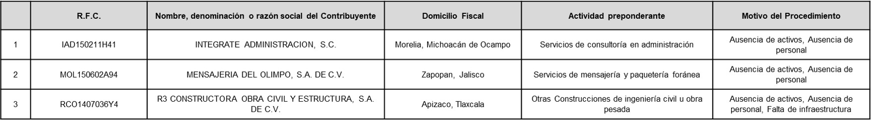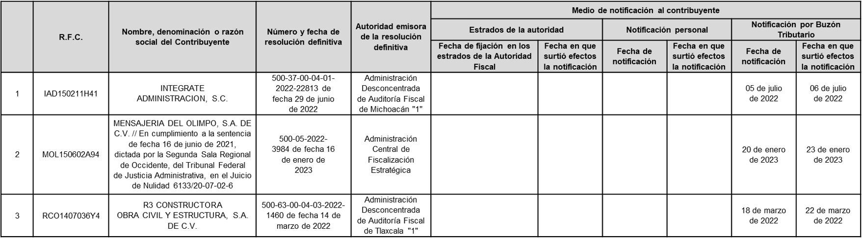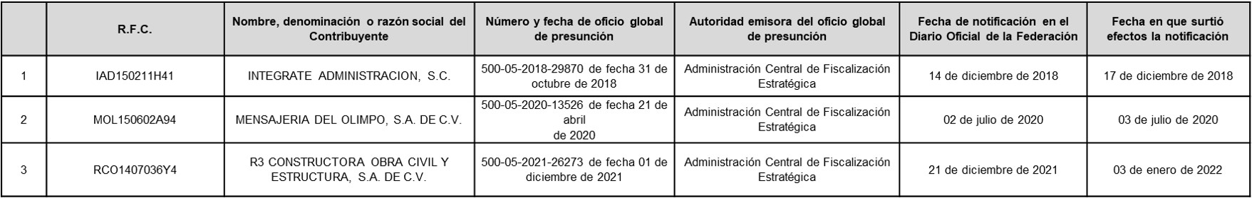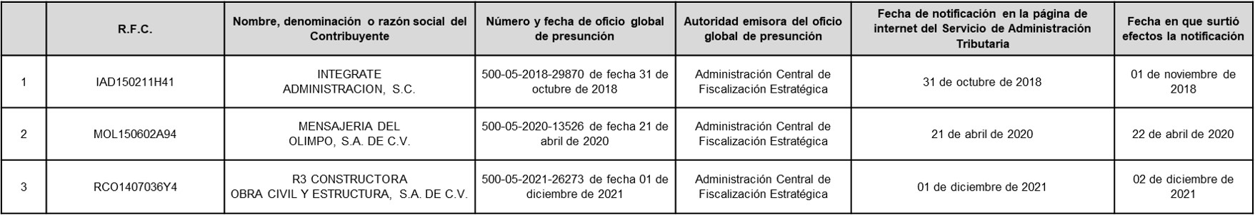 A continuación, en la siguiente tabla se enlistan los contribuyentes a los Anexo 1 del oficio número 500-05-2023-4351 de fecha 24 de abril de 2023 correspondiente a contribuyentes que, SÍ aportaron argumentos y/o pruebas, pero NO desvirtuaron el motivo por el que se les notificó el oficio de presunción, motivo por el cual se actualizó DEFINITIVAMENTE la situación a que se refiere el primer párrafo del artículo 69-B del Código Fiscal de la Federación.