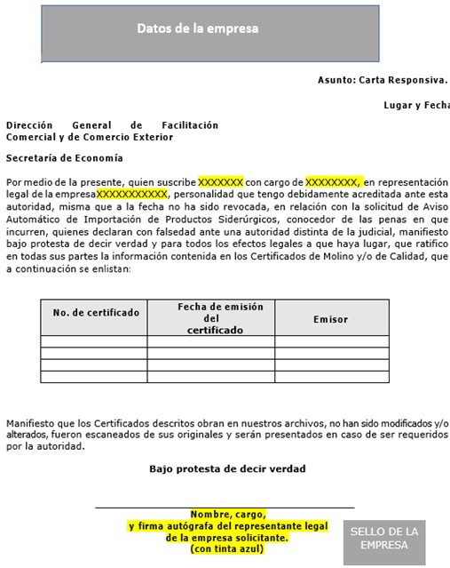 El 9 de julio de 2025, la Secretaría de Economía, a través de su portal del Servicio Nacional de Información de Comercio Exterior (SNICE), publicó un nuevo formato de Carta Responsiva en PDF para la solicitud de Avisos Automáticos de Importación de Productos Siderúrgicos. Este documento actualizado tiene como objetivo facilitar y estandarizar los trámites relacionados con el comercio exterior de productos de acero, en cumplimiento con las disposiciones establecidas en las reglas y criterios de comercio exterior de la Secretaría. Para más detalles, consulte el portal oficial de SNICE.