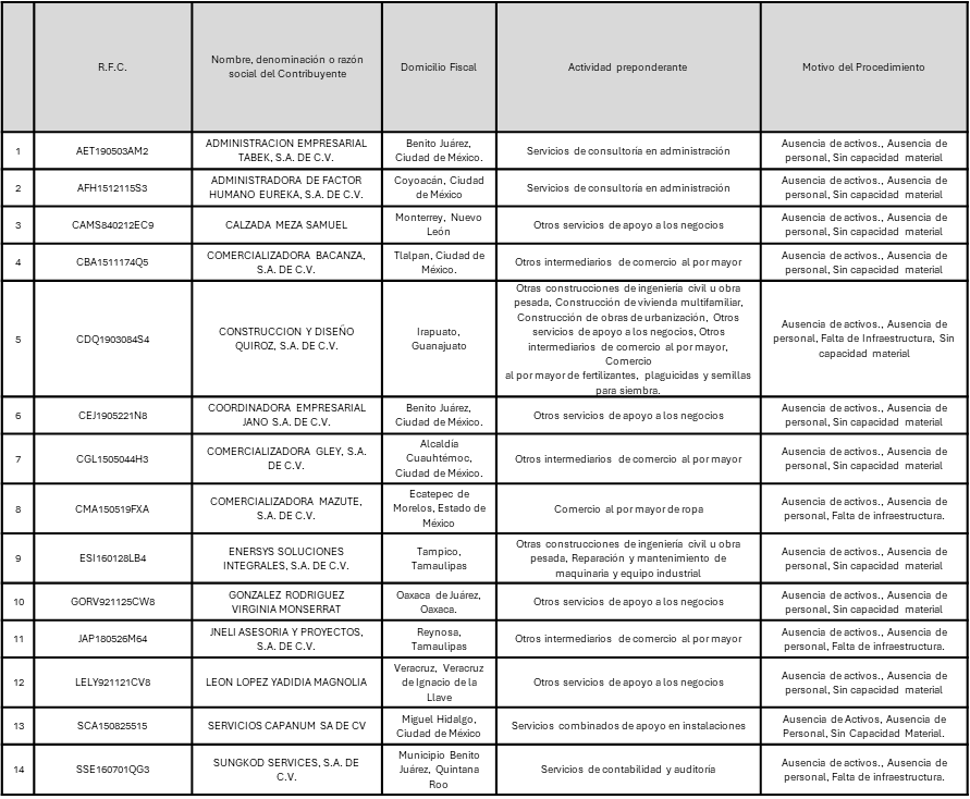 A continuación, en la siguiente tabla se enlistan los contribuyentes a los Anexo 1 del oficio número 500-05-2023-26214 de fecha 11 de diciembre de 2023 en el que se notifica a los contribuyentes mencionados en el siguiente anexo que se ubican en el supuesto de presunción previsto en el párrafo primero del citado artículo 69-B del Código Fiscal de la Federación.