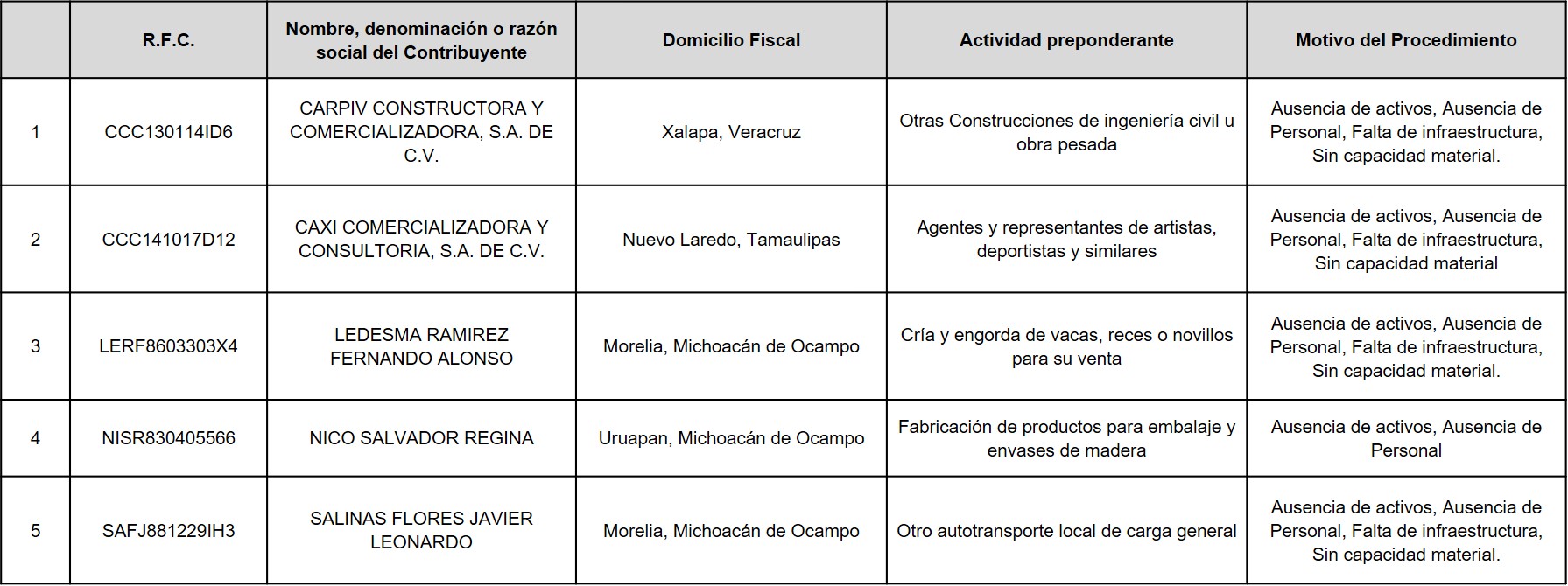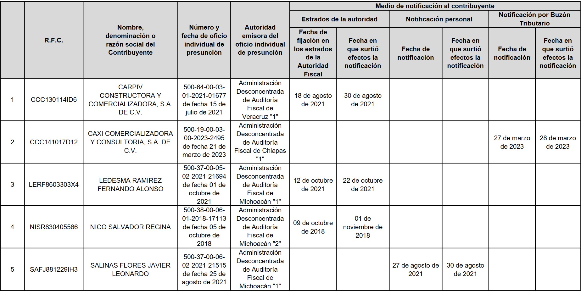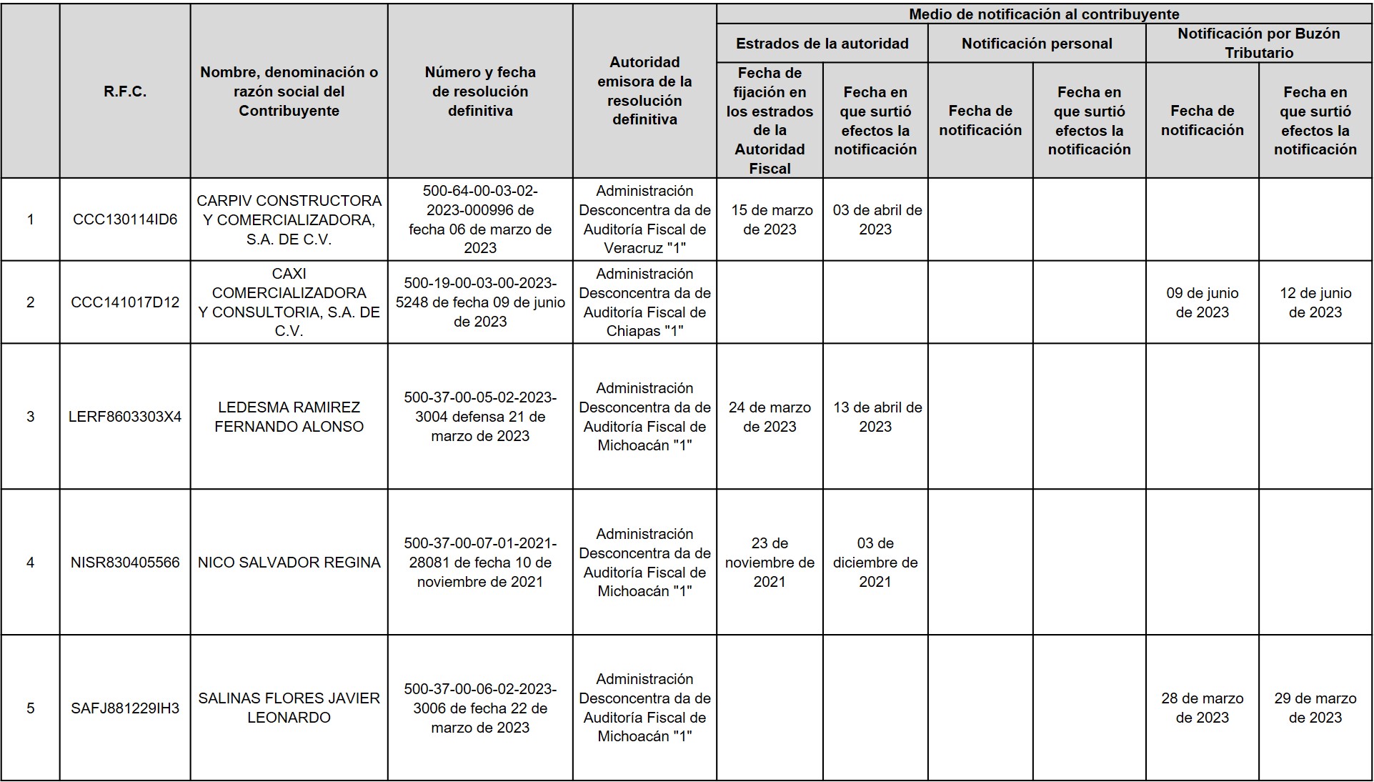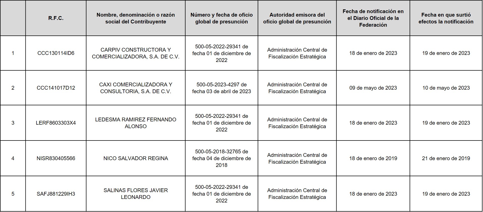 A continuación, en la siguiente tabla se enlistan los contribuyentes a los Anexo 1 del oficio número 500-05-2023-21083 de fecha 15 de agosto de 2023, correspondiente a contribuyentes que SÍ aportaron argumentos y/o pruebas, pero NO desvirtuaron el motivo por el que se les notificó el oficio de presunción, motivo por el cual, se actualizó DEFINITIVAMENTE la situación a que se refiere el primer párrafo del artículo 69-B del Código Fiscal de la Federación.