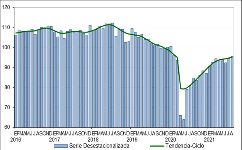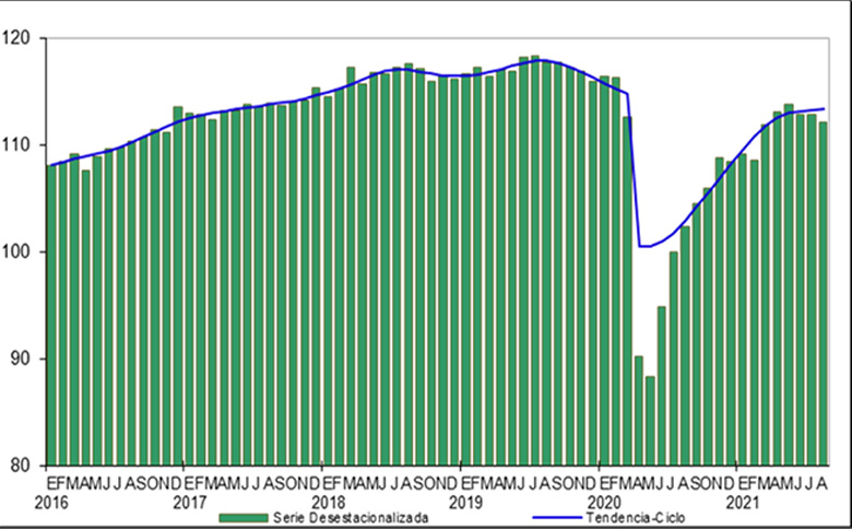 El consumo va creciendo a la par del reinicio de las actividades socioeconómicas, se observa que el Indicador Mensual del Consumo Privado en el Mercado Interior (IMCPMI) a agosto 2021 presenta una tendencia a la alza, ya que en comparación anual registró un avance de 9.6% en su interior, donde el gasto en bienes de origen importado ascendió 20.9% y el de bienes nacionales en 8.2%, siendo el aumento en bienes del 4.7%, y el de servicios del 11.7%, lo que resulta esperado puesto que ya se permiten las actividades no esenciales y por consecuencia la demanda de bienes y servicios tiende a elevarse, sin embargo todavía no se alcanzan los niveles previos a la pandemia.