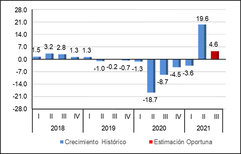 Fuente: Tomado de INEGI, Estimación Oportuna del Producto Interno Bruto, al tercer trimestre 2021, cifras originales, variación porcentual real respecto a igual trimestre del año anterior.
